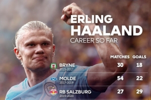 英超官方晒哈兰德进球分布:曼城149场127球,挪威队45场48球