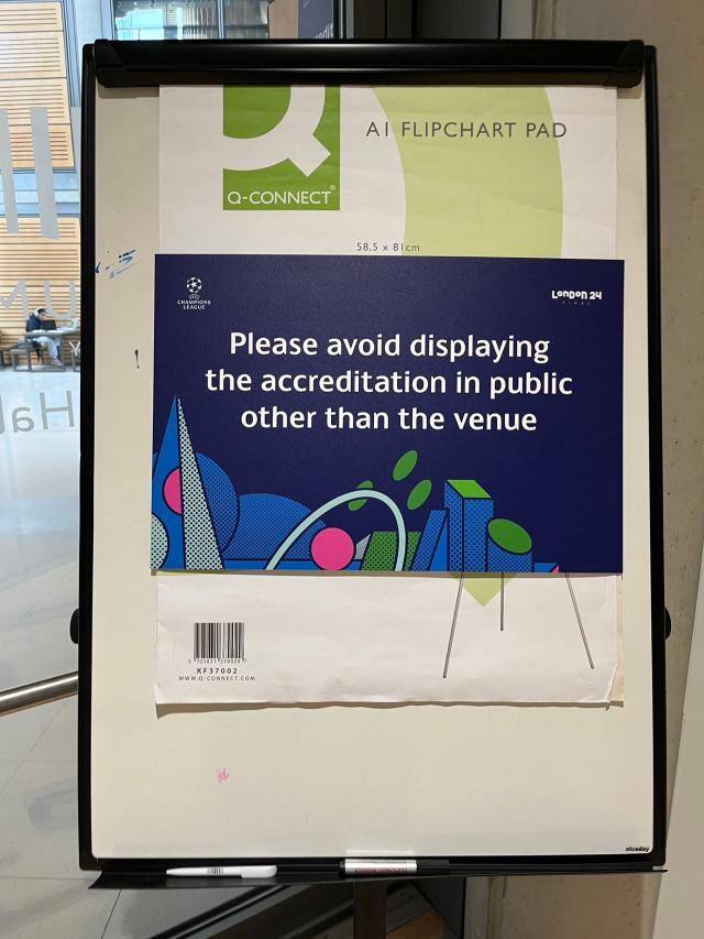 欧冠决赛的制证中心位于温布利球场北侧的社区文化中心,这里的二楼被临时当做了制证中心和志愿者中心使用。中心大屏幕上的“温馨提示”让人多少收起了几分放松:请在离开工作区域后确认摘下自己佩戴的证件,尤其是请勿在球迷聚集处附近的公共区域佩戴!在决赛门票紧缺的状况下,看来最近几届决赛抢劫媒体证件的案件时有发生。