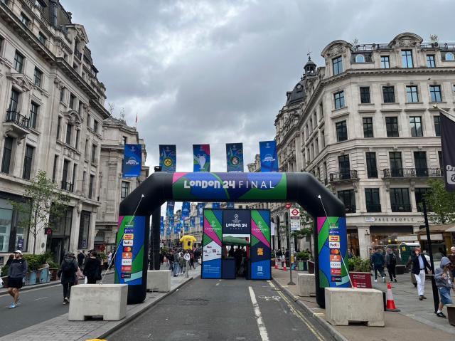 和冷清的温布利相比,当天伦敦的热闹之处其实在市中心的摄政街上。这条伦敦最为宽敞气派的大街当天彻底封路,写有“伦敦 24 决赛”的拱门在摄政街两侧的出入口处竖起,路中央搭建了一座临时舞台,背景屏幕上播放着两队晋级决赛的进球集锦,舞台上定时会有美声合唱,将欧冠主题曲的旋律放送到隔壁的牛津街和皮卡迪利广场,以吸引更多人气。这里沿街除了赞助商的各种体验活动之外,欧足联还在这里露天搭建了数处可供打卡拍照的景点,既有两队的巨型球衣展示,还有模拟新闻发布会的场景,吸引了一众行人围观拍照。不过,这里吸引的主要还是那些原本就要来此购物的游人。你甚至会听到排队拍照的人群里有人迷惑地询问同伴:“这两支球队下个月还会去德国参加欧洲杯么?”